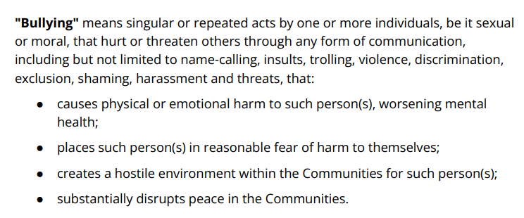 《社区规章》第 5 节(欺凌行为)中,新扩展的规则根据现行法律定义界定了何为欺凌,也对欺凌行为的处理比以前严厉得多。