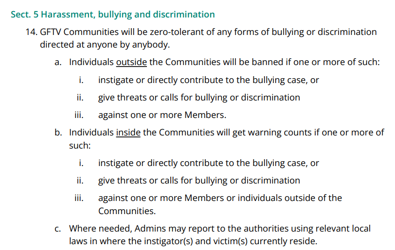 This rule expansion all aims to close up major loopholes created by plain general statements in the CR’s previous version and ensure that GFTV’s Communities remain a safe and wholesome space.