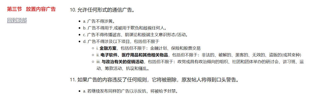 第 3 节(放置内容广告)的内容控制更加明确,规定了哪些内容可以和不可以在兽视社区空间进行广告宣传。